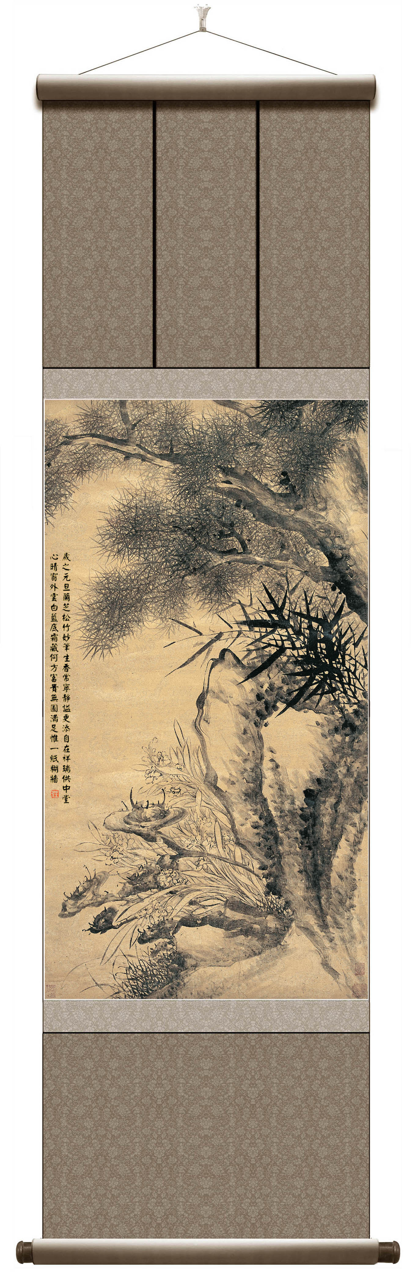 所藉明•归昌世《五友图》,立轴,描银云龙纹蜡笺,墨笔,画面纵132厘米,横72厘米。