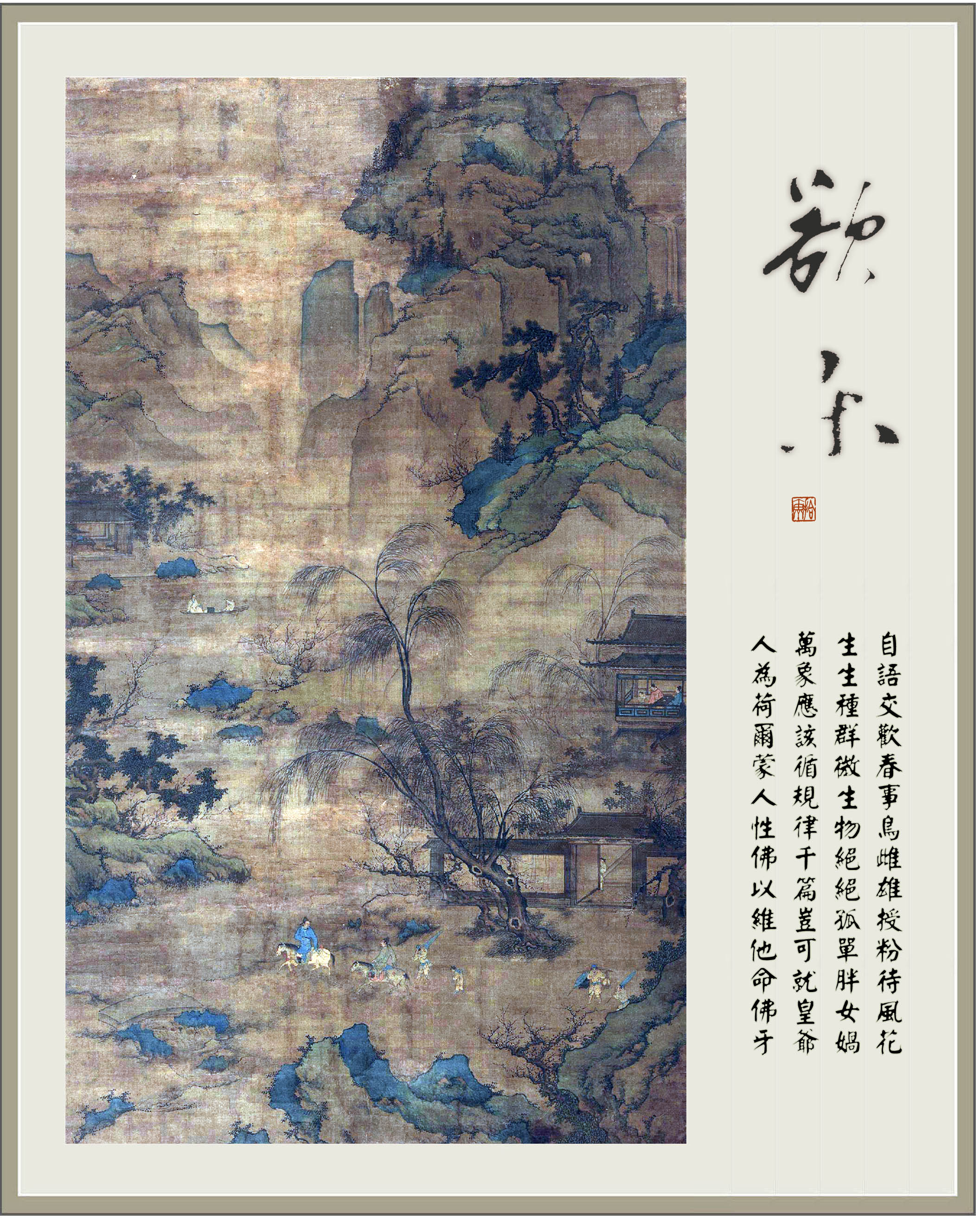 此乃电脑装裱之古画今题,易趣作为,所藉?•佚名《游春图》,立轴,绢本,设色;画幅面纵1178厘米,横103厘米。