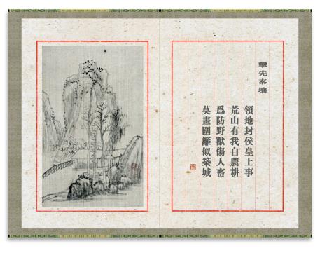 所藉明洪武三年(1370)徐贲《山水》,册页,纸本,墨笔,八开,每幅画面纵17厘米,横10厘米。原本无标题。