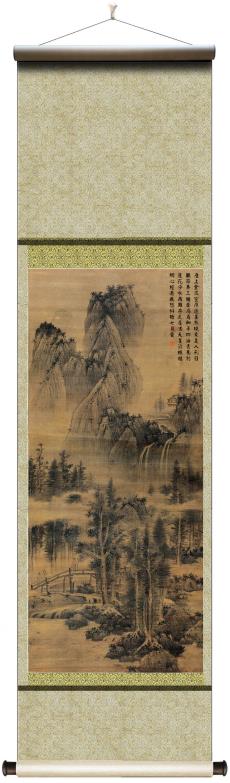 所藉明•蓝瑛《九夏清泉》,立轴,绢本,墨笔,设色,幅画面纵225厘米,横96.5厘米。