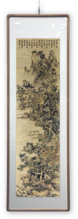 所藉明•蓝瑛《秋溪双棹图》,立轴,绢本。大都会博物馆藏。