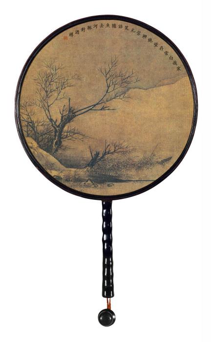 所藉南宋•梁楷《雪景山水图》。扇面画,绢本,水墨,浅设色,私人藏。