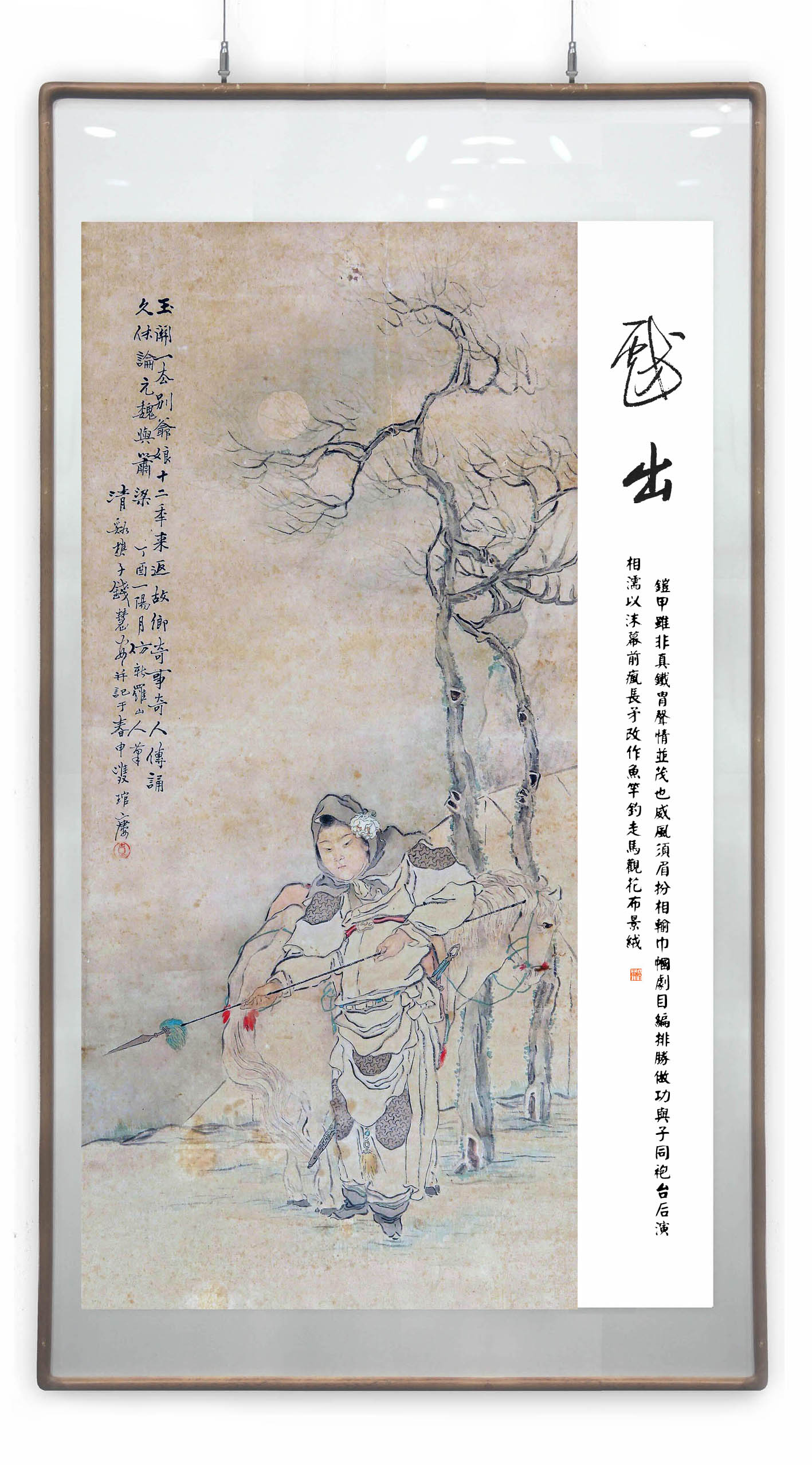 所藉清•钱慧安光绪二十三年(1897)年所作《木兰从军图》,立轴,绢本,设色,画幅纵85,横19厘米。原款识:“玉关一去别爷娘,十二年来返故乡。奇事奇人传诵久,休论元魏與萧梁”。