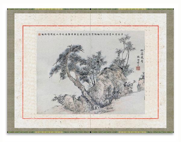 所藉清•王宸《拟古山水冊》,十二开册页之十,纸本,设色,画心纵38厘米,横48厘米,题识:“蓬心去东”。