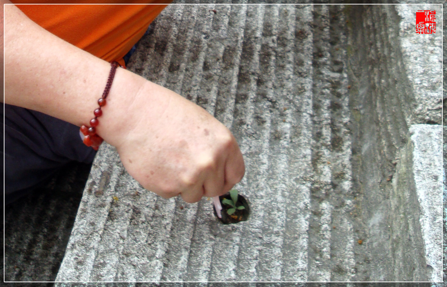 就这样,我们五人择地合种了一棵野草,在“洗心桥”头近处,一块大岩石的下方,湿润的土壤之上,阳光和树阴交错着。这回是小明和阿忠精心作业,我拍下了他俩一小一大的手和一棵小小的草。