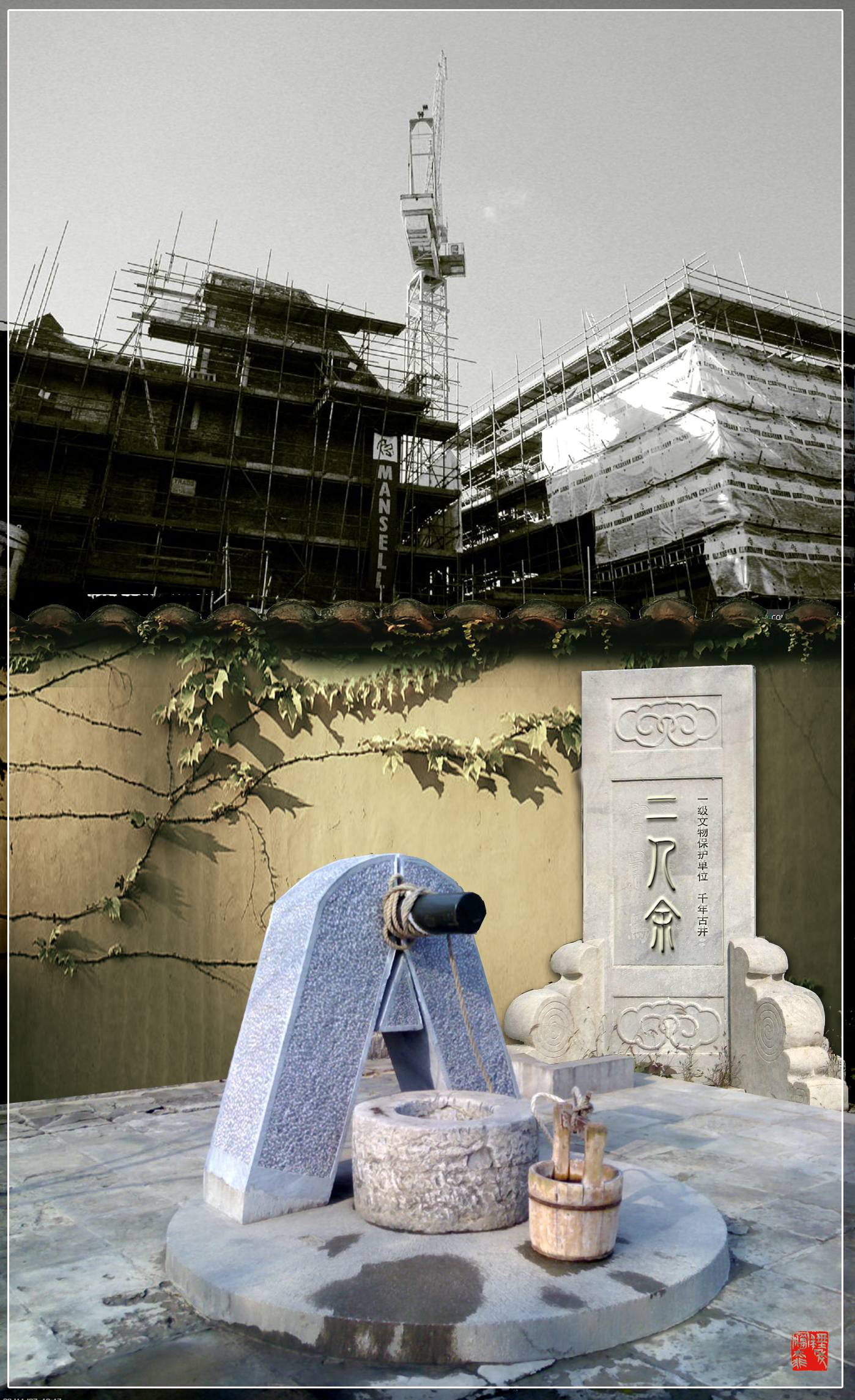 后来的后来,小子大喜,笑醒。急匆匆,忙叠叠,赶去一看,哪里还有犄角旮旯?丫的被一片房地产商给开发了。所幸,那井还在。可是,四方的井栏改换成了旧的圆石围,一旁还多了一个A字形的花岗石井架和辘轳,甚至还有只木提桶。基座也改得面目皆非了。就连自己刻的碑也不知去向,而原处却不明不白矗立起一块明明白白又大又新的碑:“一级文物保护单位 千年古井‘二人余’”。