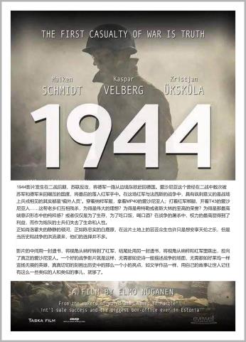 夜晚干脆不去想它,看《1944》——爱沙尼亚2015年拍摄的故事片!临躺上床前,在备忘录里写道:“对二战期间被苏俄红军强征的、自愿加入德军的分别有55000名、72000人,致使其在本国前线对峙的双方实是同胞,大多数人与爱国无关,与生计无关,与仇恨无关。那么,其中复杂的历史才是人为的因果。我现在看到的影评乱的很。若搁置这些背景,单就看到的人物和事件的表现而言,我能感受到的人性和民族归属的天然,但又一定远不及爱沙尼亚人。”