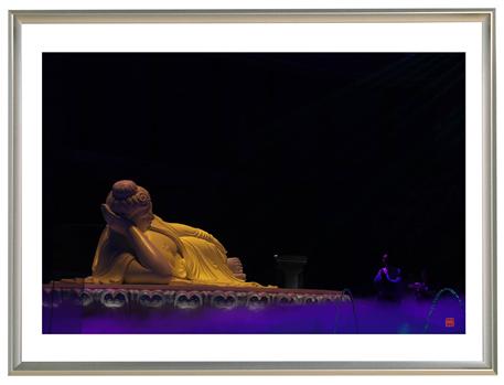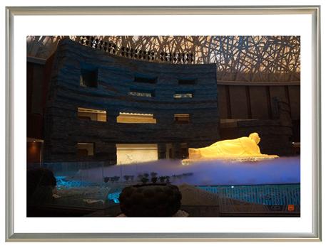 在佛顶宫的“禅境大观”里,观看圆形穹顶上,投射下的多彩灯光,使一尊全长 7 米 5 、全铜铸造、其表仿以汉白玉材质的“佛涅槃”敷衍变换众色,我一直处在现实的电声操控中,虽然幻化,但失庄严;尽管高大,却不震撼;纵使好看,也绝无激动可言。尤其当眼见那些痴人,明明是用钱去买极高价位的蜡烛台,却只能说“请”莲花灯;刚刚登台把“请”来的灯,献到佛前,过后,想想这灯盏又再被管理员回收转卖给别人,……那种机器洪声传播引导的仪式,在干冰烟雾机吐露的飘渺舞台之上,在 6000 平方米面积的那殿堂里面,自卧佛从地宫下升起, 360 度缓缓旋转,到然后的再降下不见,整个过程约 20 分钟,就是广播说的“表演现在开始”和“表演现在结束”吗?