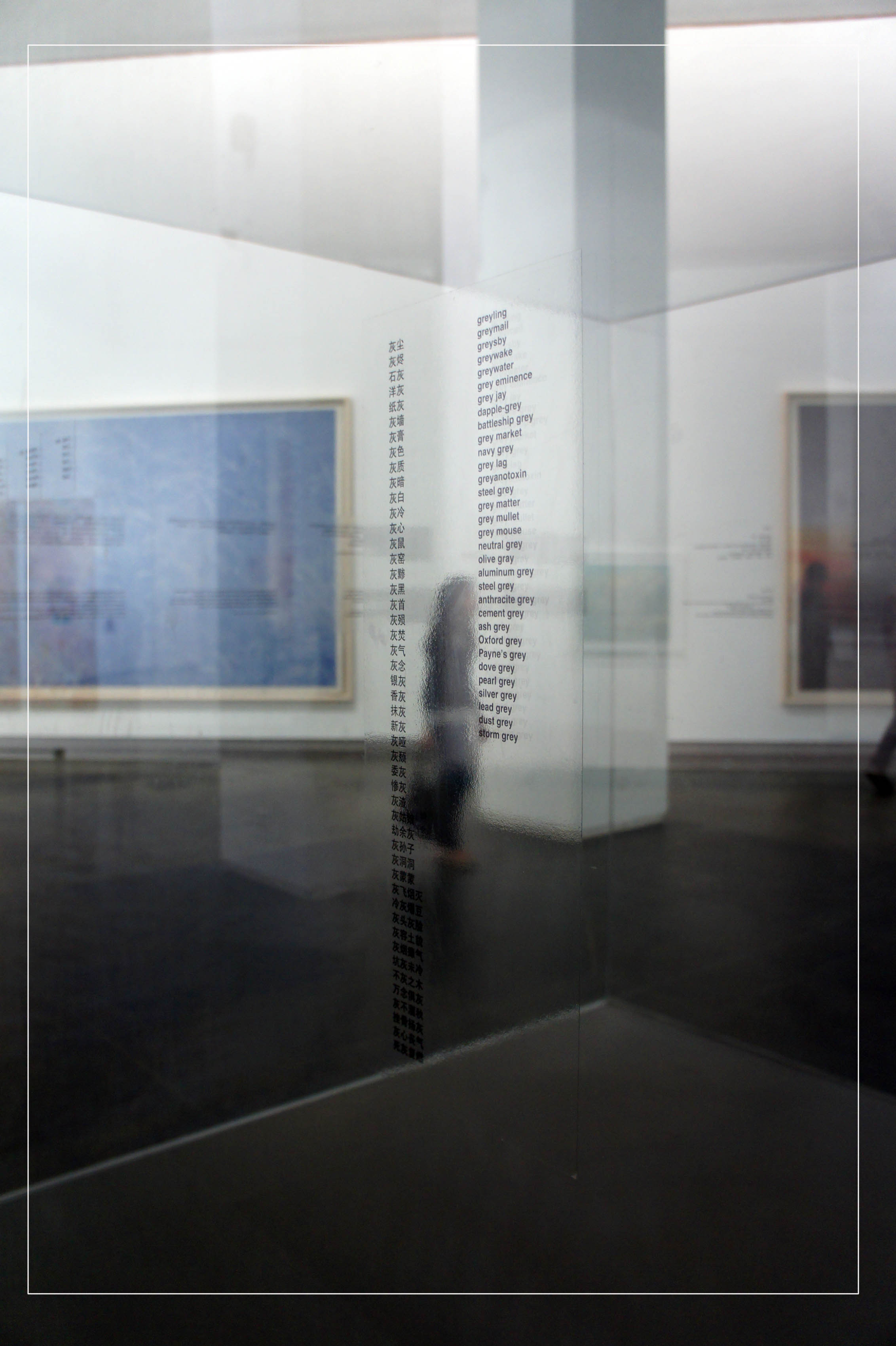 《灰》是于主题最贴切的“作品”。有所文字的解释,以黑体字打印在完全透明的胶带上,胶带在大玻璃合适人的视线高度平贴成一围。摘自汉娜•福尔摩斯《灰尘的秘密生活》关于螨虫及其活动环境的叙述;对不同灰色及其寓意的说明等等。最是要让参观者从中见所未见——也就是必须凭借其提供的灰色地毯“灰”的核心“元”,凭空想像其以上的空间,人们肉眼所看不见的,包括它罗列出来的:“灰尘、灰烬、石灰、洋灰、纸灰、灰墙、灰膏、灰色、灰质、灰暗、灰白、灰冷、灰心、灰鼠、灰窑、灰黪、灰黑、灰首、灰殒、灰焚、灰气、灰念、银灰、香灰、抹灰、新灰、灰哑、灰颓、委灰、惨灰、灰渣、灰姑娘、劫余灰、灰孙子、灰洞洞、灰蒙蒙、灰飞烟灭、冷灰爆豆、灰头灰脸、灰容土貌、灰烟瘴气、坑灰未冷、不灰之木、万念俱灰、灰不溜秋、搜骨扬灰、灰心丧气、死灰复燃”。