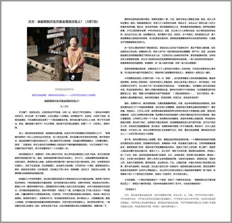 方方3月7日的日记被404了。通过百度搜索在http://www.yingdianzi.com/zaker/14748.html 看到全文。她开始写第一篇封城日记,我逐一都看了。还是仅就文笔来说, 3月5日、7日,写出了高水平。这才是作家的高水平。比较前面她的文笔问题,会不会是与她身体状态有关;还有,也可能作家内心的压抑和痛苦还在心地底下流淌,尚未找到真正的出口;还可能没有被足够的刺激激发起来。好了,这一二天,她既可能受到 乌有之乡那一伙最强的围剿,她还尽可能压抑恼火的时候,来了要对武汉人民进行感恩教育的号召,做一下子,她的激情被烧着了,文笔便成了怒火中烧的火把。