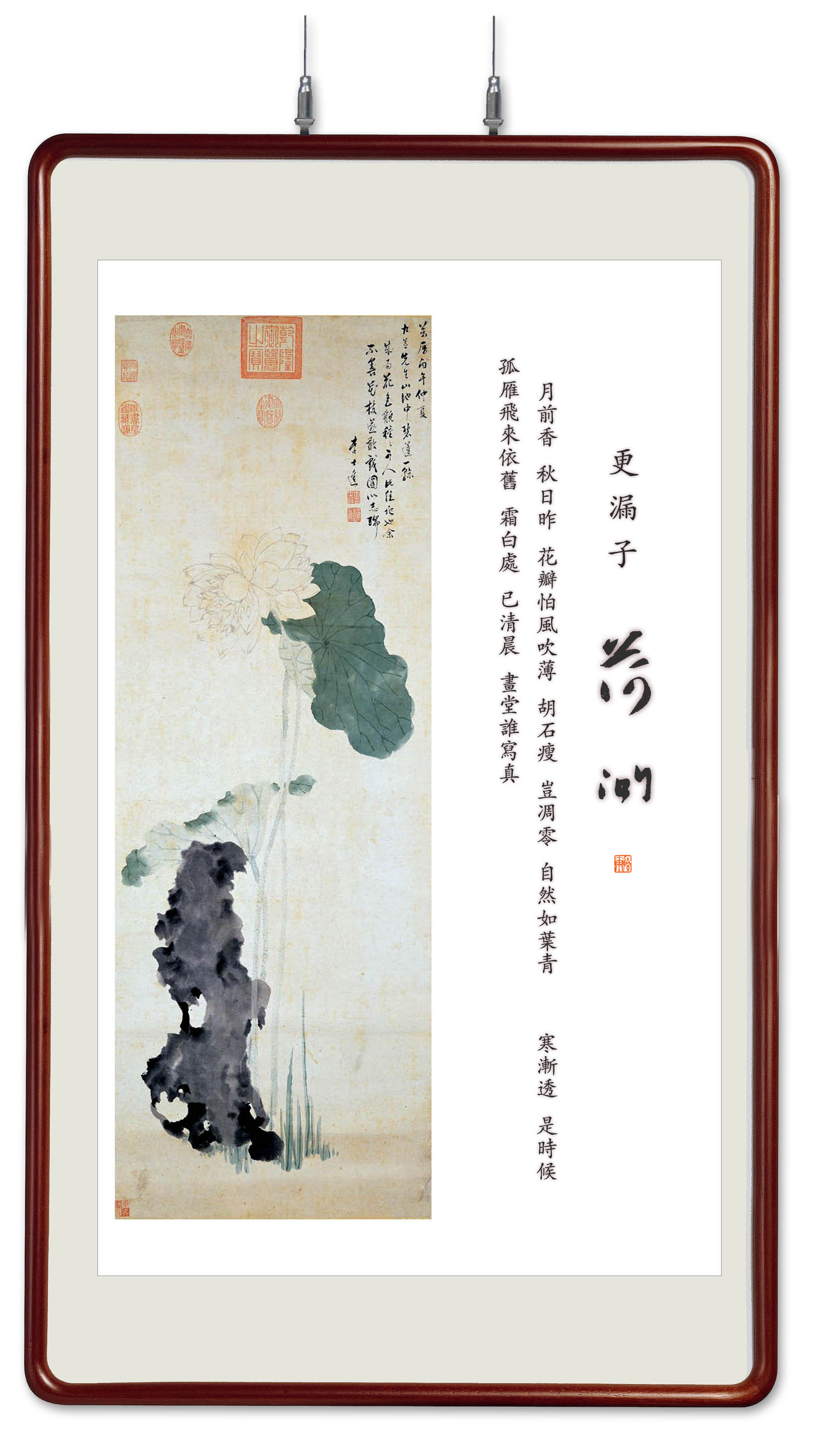 月前香,秋日昨,花瓣怕风吹薄。胡石瘦?岂凋零!自然如叶青。 寒渐透,是时候,孤雁飞来依旧。霜白处,已清晨,画堂谁写真?