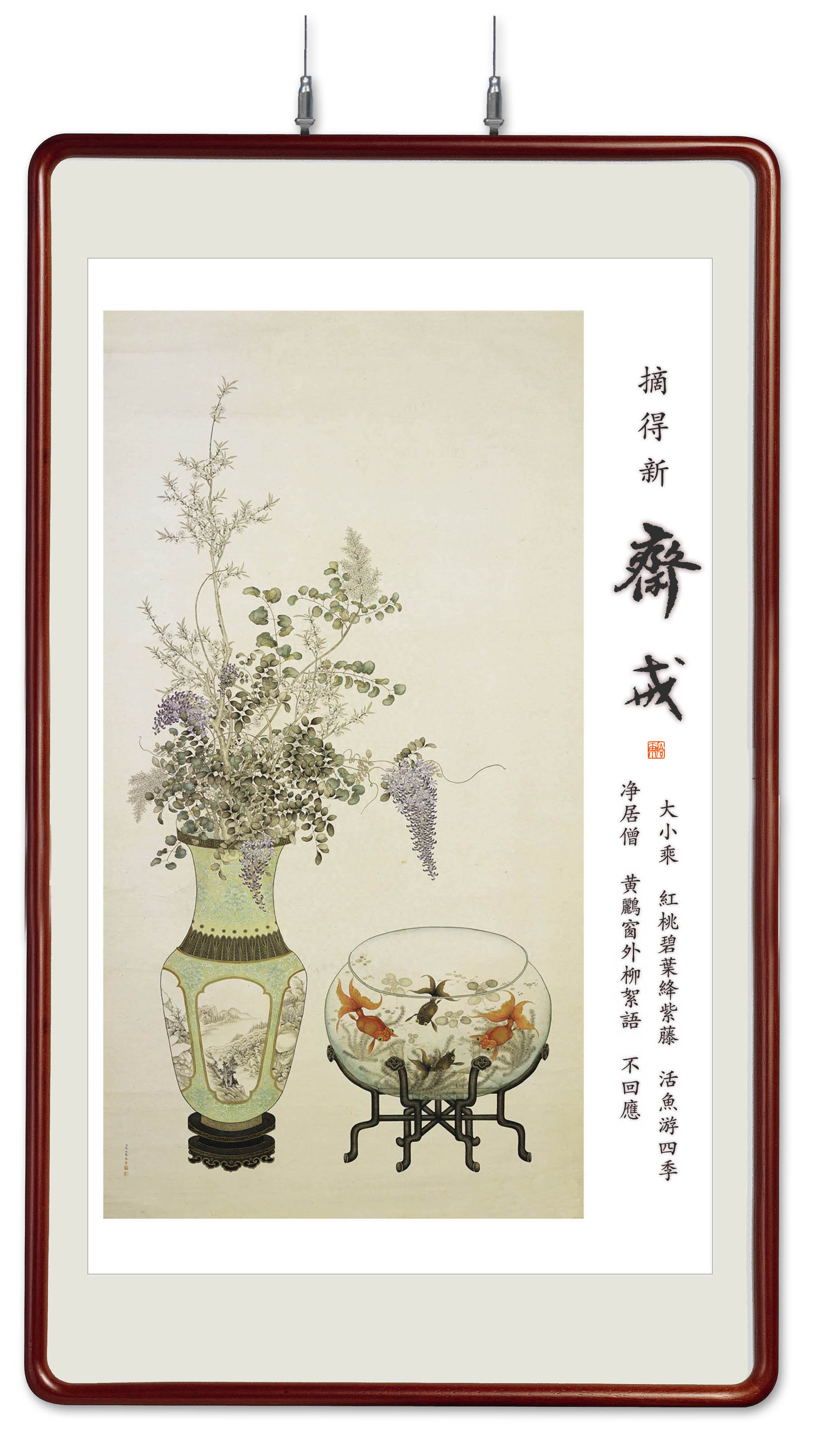 大小乘,红桃碧叶绛紫藤。活鱼游四季,净居僧。黄鹂窗外柳絮语,不回应。