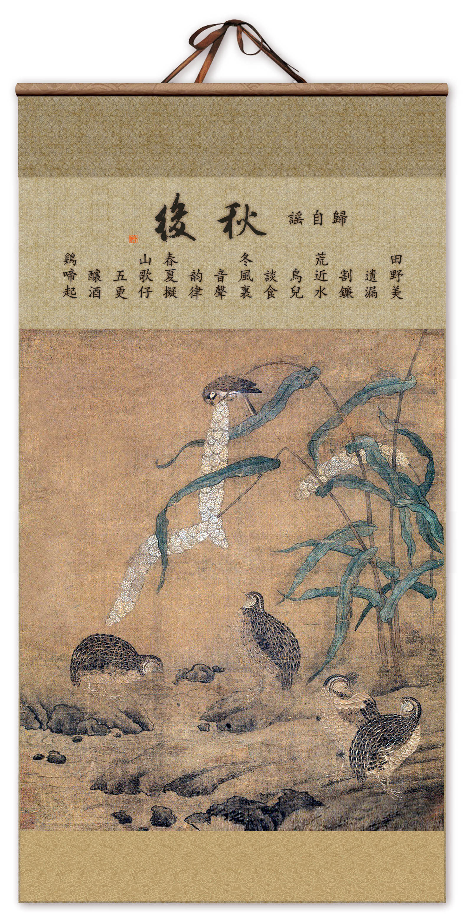 所藉南宋 · 李安忠《丰稔图》,立轴,设色,绢本,纵 58.6 厘米,横 50 厘米。见著郑振铎根据大正十五年(公元历 1926 年)日本京都博物馆特别展览《支那花鸟画册》编录的《域外所藏中国古画集之四—· 宋画》。