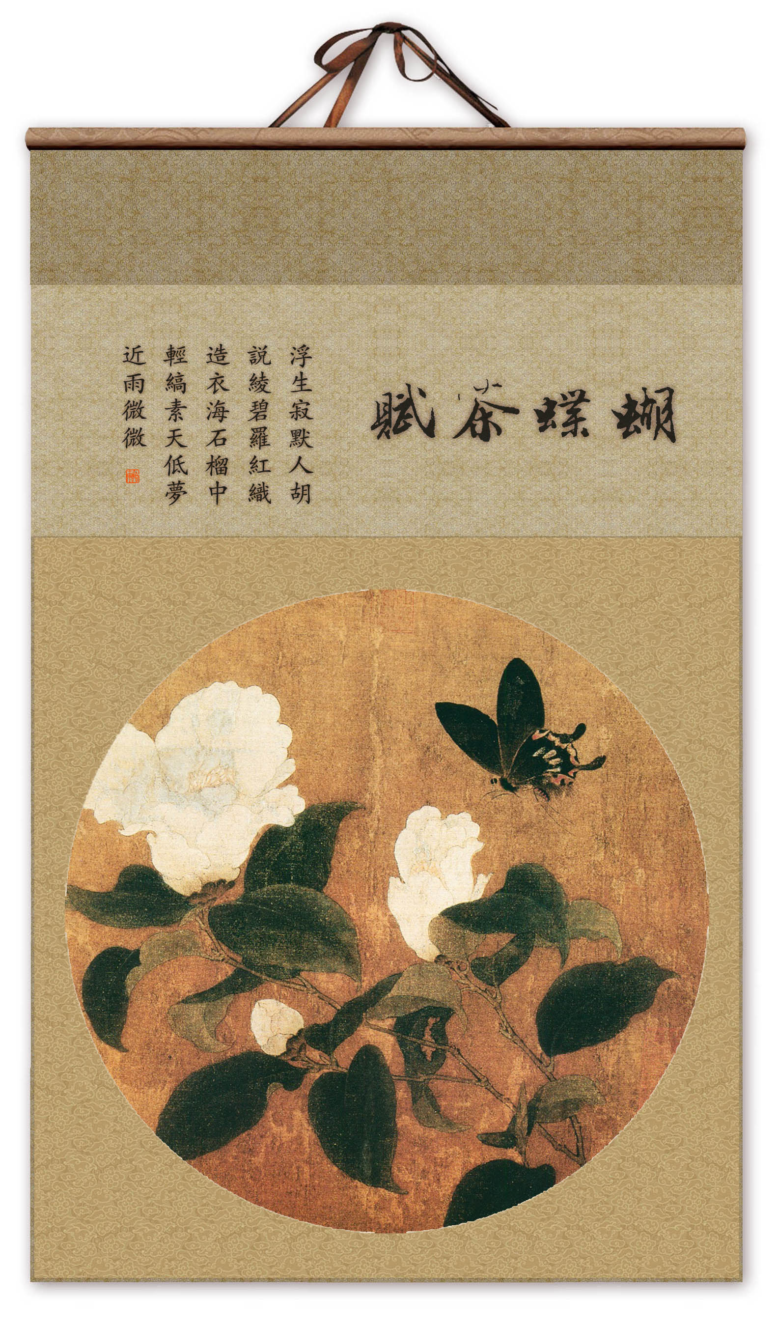 本篇所藉《山茶蝴蝶图页》,系南宋作品,作者佚名,绢本,设色,纵23 厘米,横 23.5厘米,上海博物馆藏。