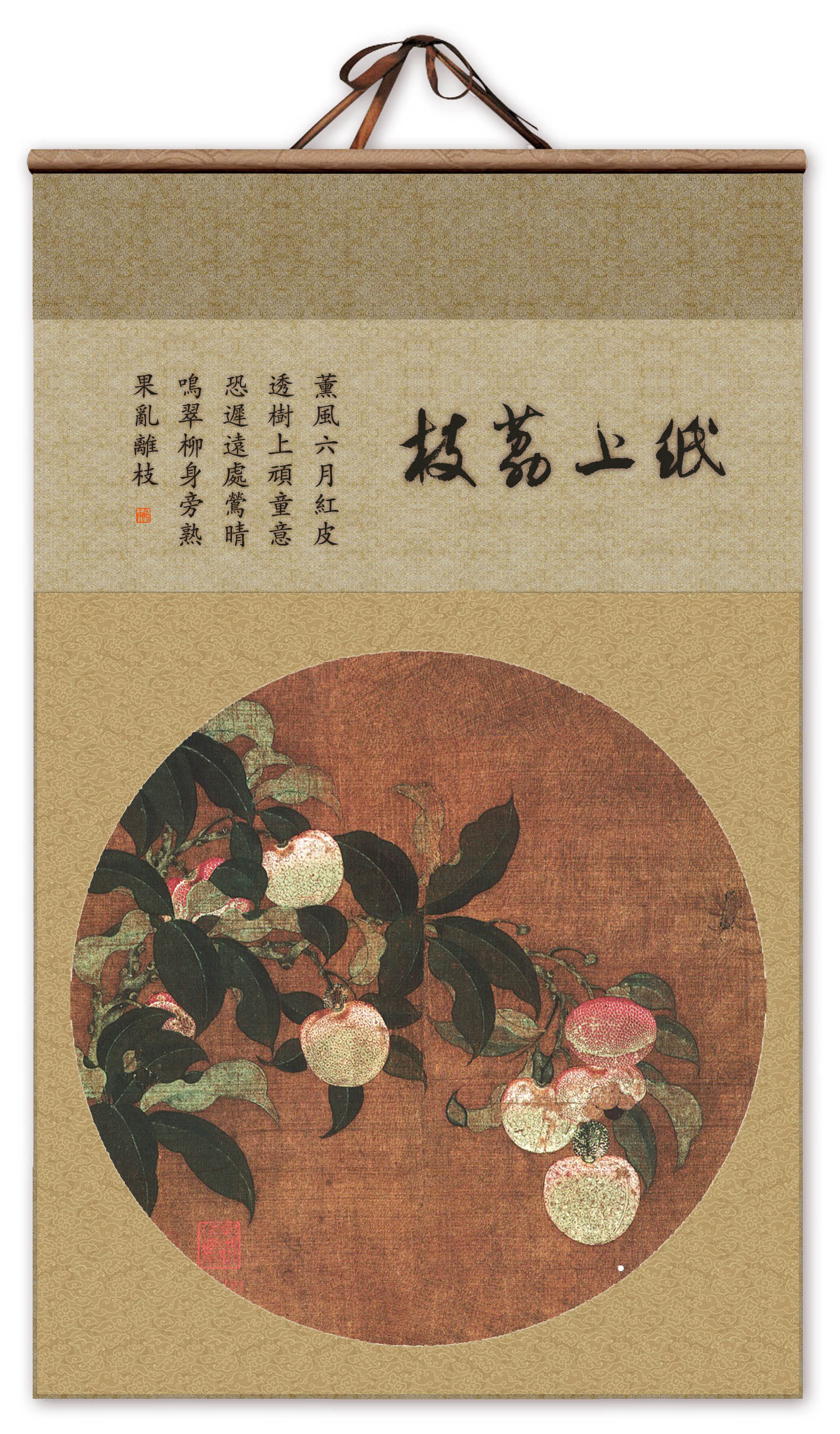 本篇所藉《荔枝图页》,系南宋作品,作者佚名,纨扇页,绢本,设色,纵 24.3 厘米,横 24.3 厘米,上海博物馆藏藏。