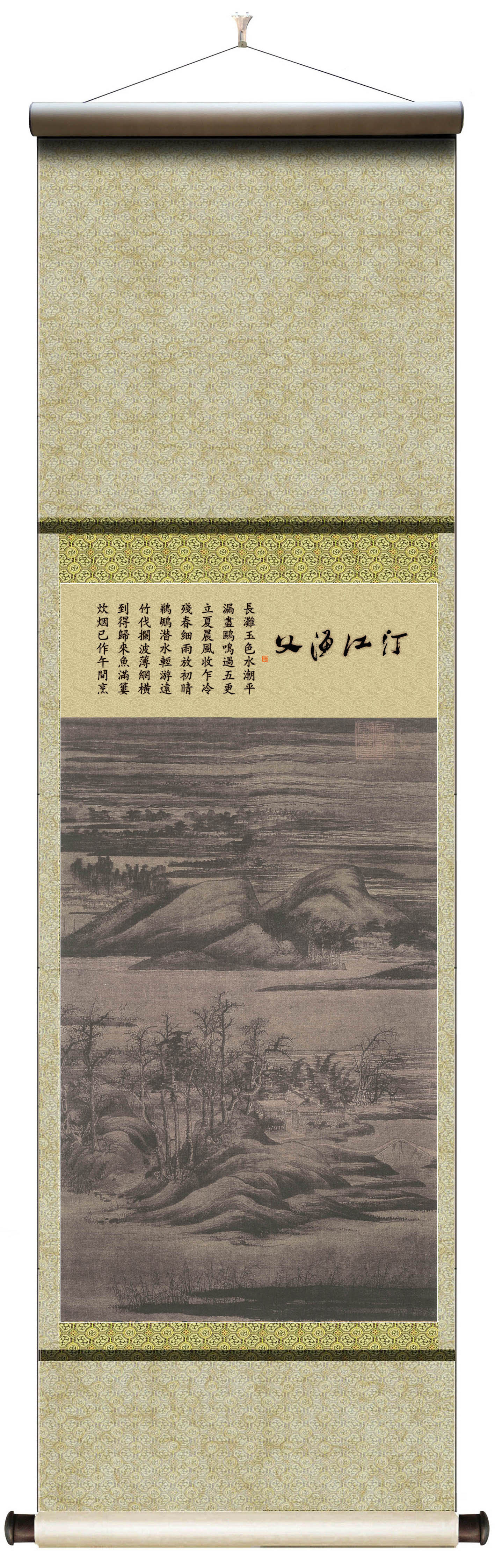 藉五代 南唐 · 董源《寒林重汀图》,绢本,设色,纵 181.5 厘米,横 116.5 厘米,日本兵库县黑川文学院藏。