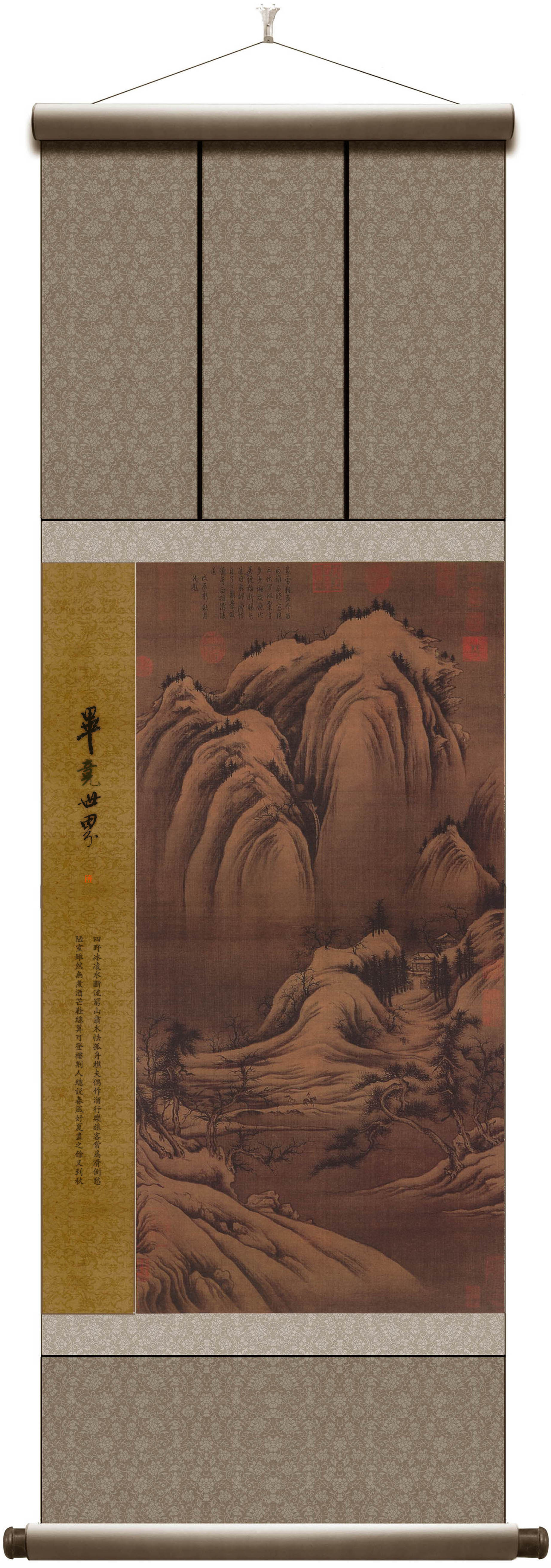 藉北宋 · 巨然《雪图》,绢本,墨笔,纵 103.5 厘米,横 22.5 厘米,台北故宫博物院藏。