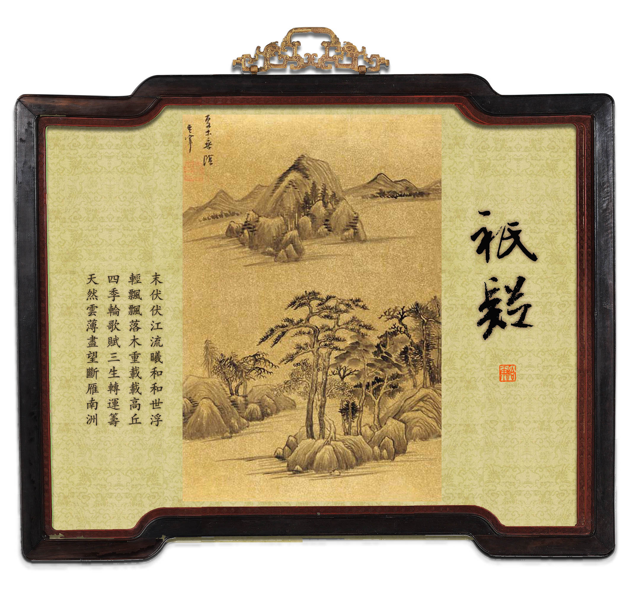 所藉据传明 · 董其昌《书画合璧山水小景(十二帧)之一 · 夏木垂阴》,册页绘画,绫本,纵 38.5 厘米,横 26.5 厘米。