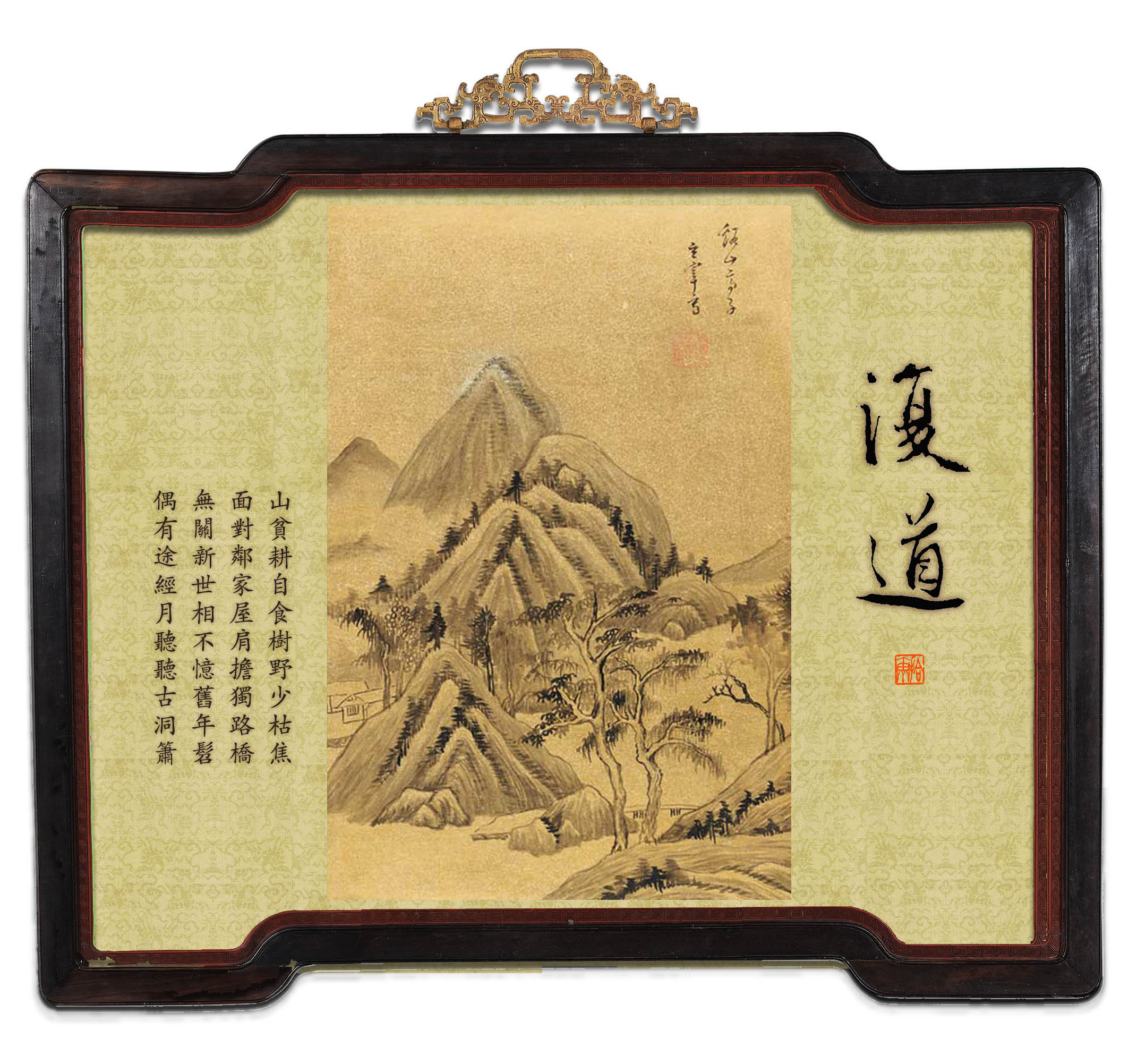 所藉据传明 · 董其昌《书画合璧山水小景(十二帧)之七 · 溪山亭子》,册页绘画,绫本,纵 38.5 厘米,横 26.0 厘米。