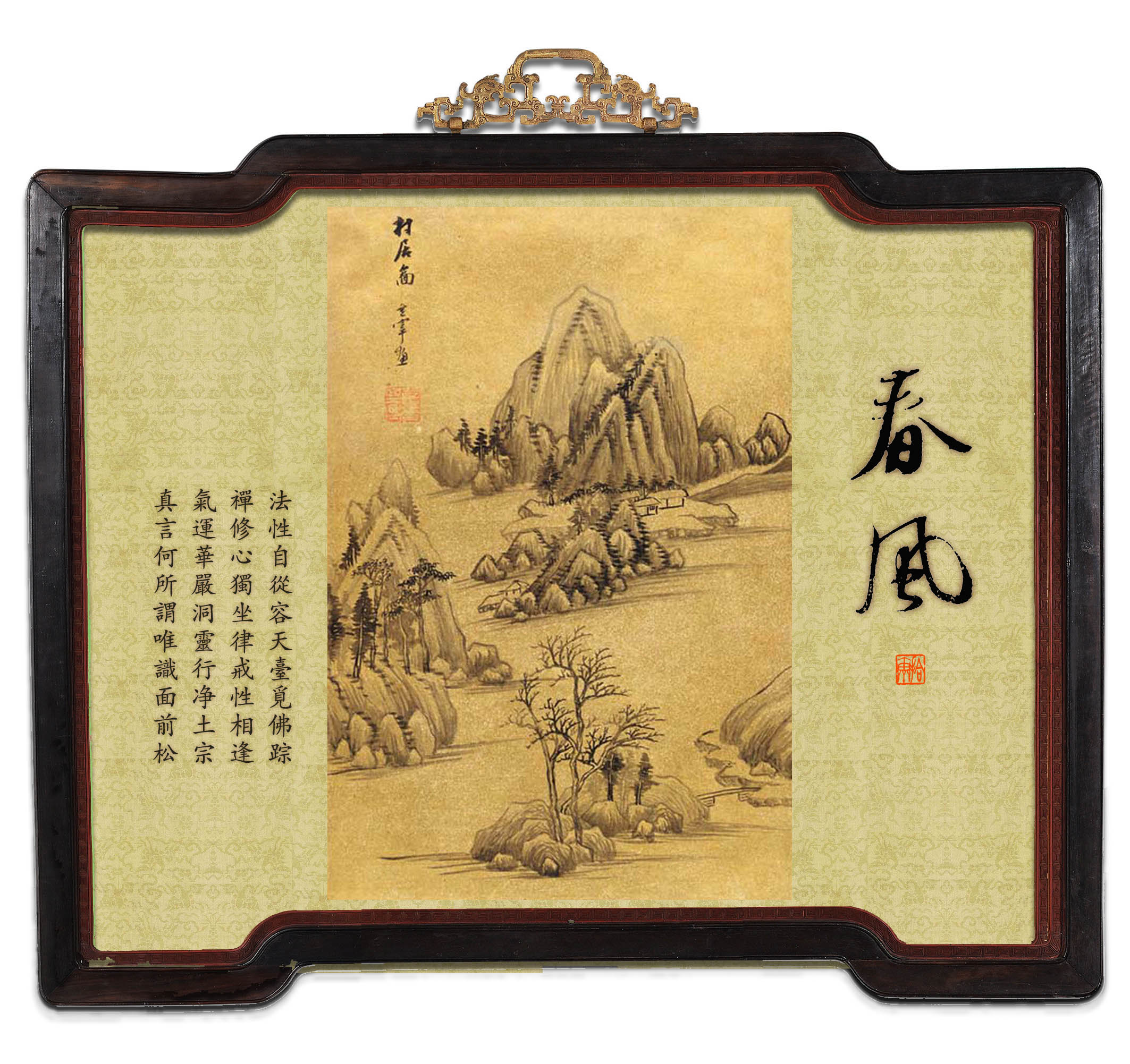 所藉据传明 · 董其昌《书画合璧山水小景(十二帧)之九 · 村居图》,册页绘画,绫本,纵 38.5 厘米,横 26.0 厘米。