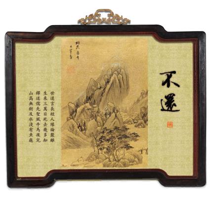 所藉据传明 · 董其昌《书画合璧山水小景(十二帧)之十一 · 烟岚萧寺》,册页绘画,绫本,纵 38.5 厘米,横 26.0 厘米。