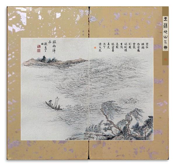 所藉清•王宸《擬古山水冊》冊頁(十二开)之一,紙本,水墨,設色,每幅纵38厘米, 横48.5厘米。