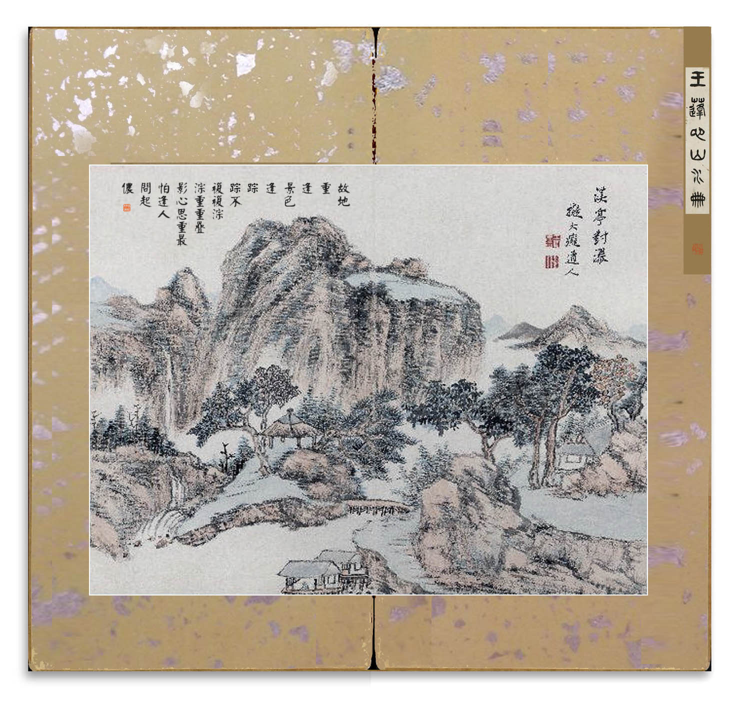所藉清•王宸《擬古山水冊》冊頁(十二开)之一,紙本,水墨,設色,每幅纵38厘米, 横48.5厘米。