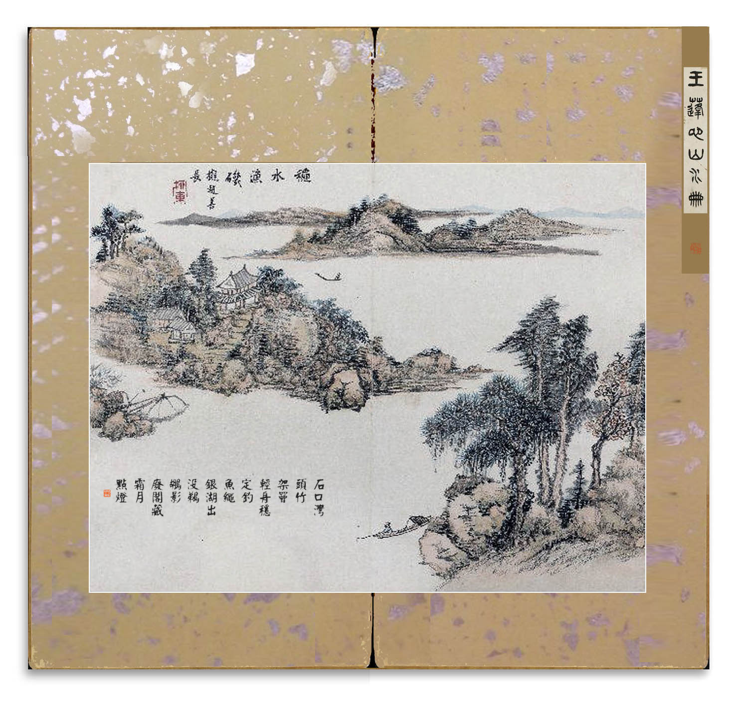 所藉清•王宸《擬古山水冊》冊頁(十二开)之一,紙本,水墨,設色,每幅纵38厘米, 横48.5厘米。