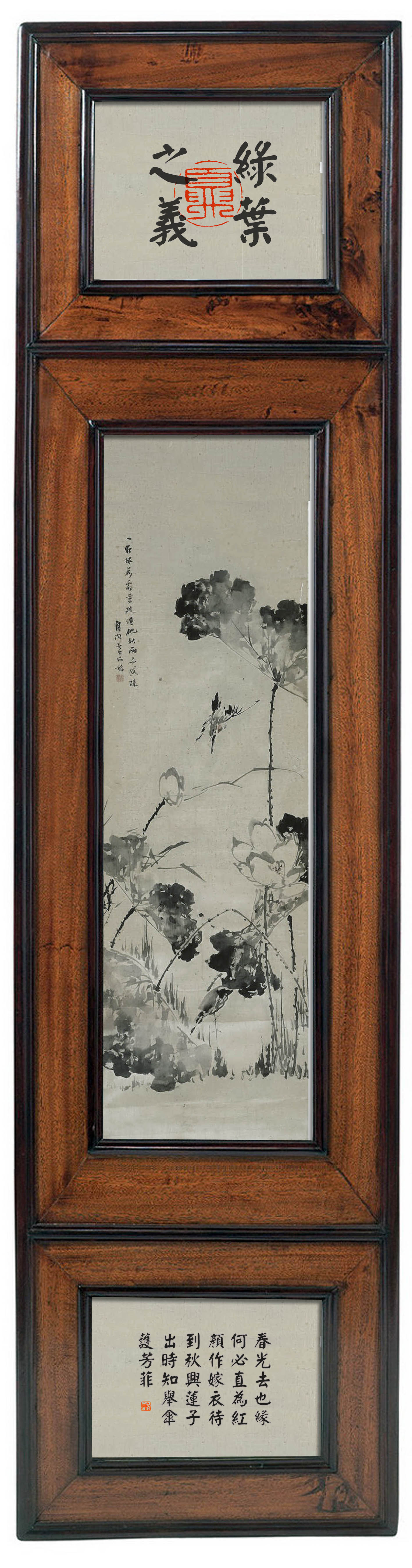 所藉清•刘锡龄《春夏秋冬四屏》之二夏,绢本,设色,镜片每幅纵152厘米,横46厘米。