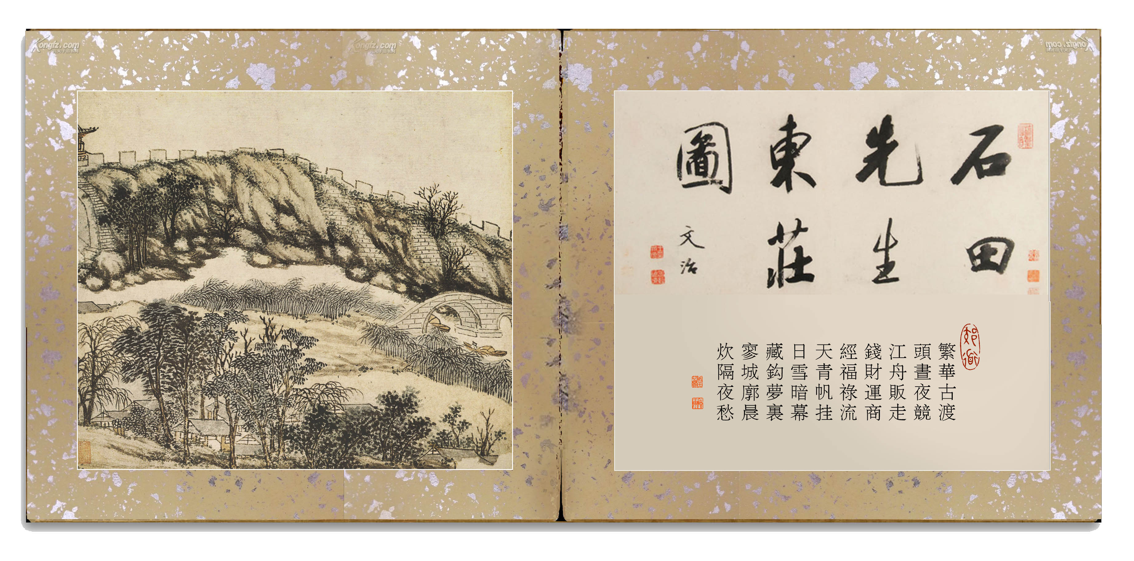 明·沈周《东庄图册》。纸本,浅设色,原有24开,遗失3开,存21开,每开图纵28.6厘米,横33厘米,南京博物院藏。此所藉乃第一开《东城》古画今题,标目及内容已非原意。