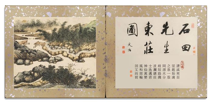 明•沈周《东庄图册》。纸本,浅设色,原有24开,遗失3开,存21开,每开图纵28.6厘米,横33厘米,南京博物院藏。此所藉乃第二开《西溪》古画今题,标目及内容已非原意。