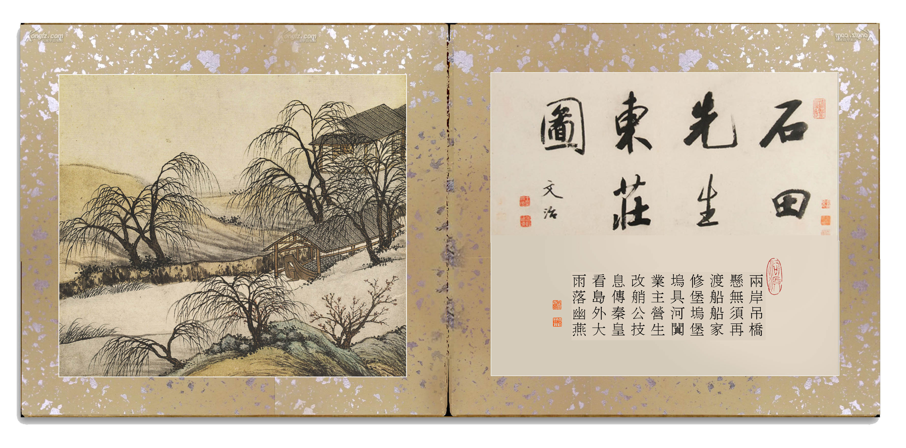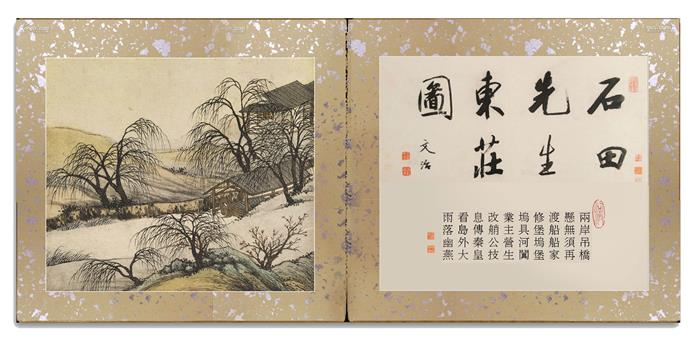 明•沈周《东庄图册》。纸本,浅设色,原有24开,遗失3开,存21开,每开图纵28.6厘米,横33厘米,南京博物院藏。此所藉乃第七开《艇子浜》古画今题,标目及内容已非原意。
