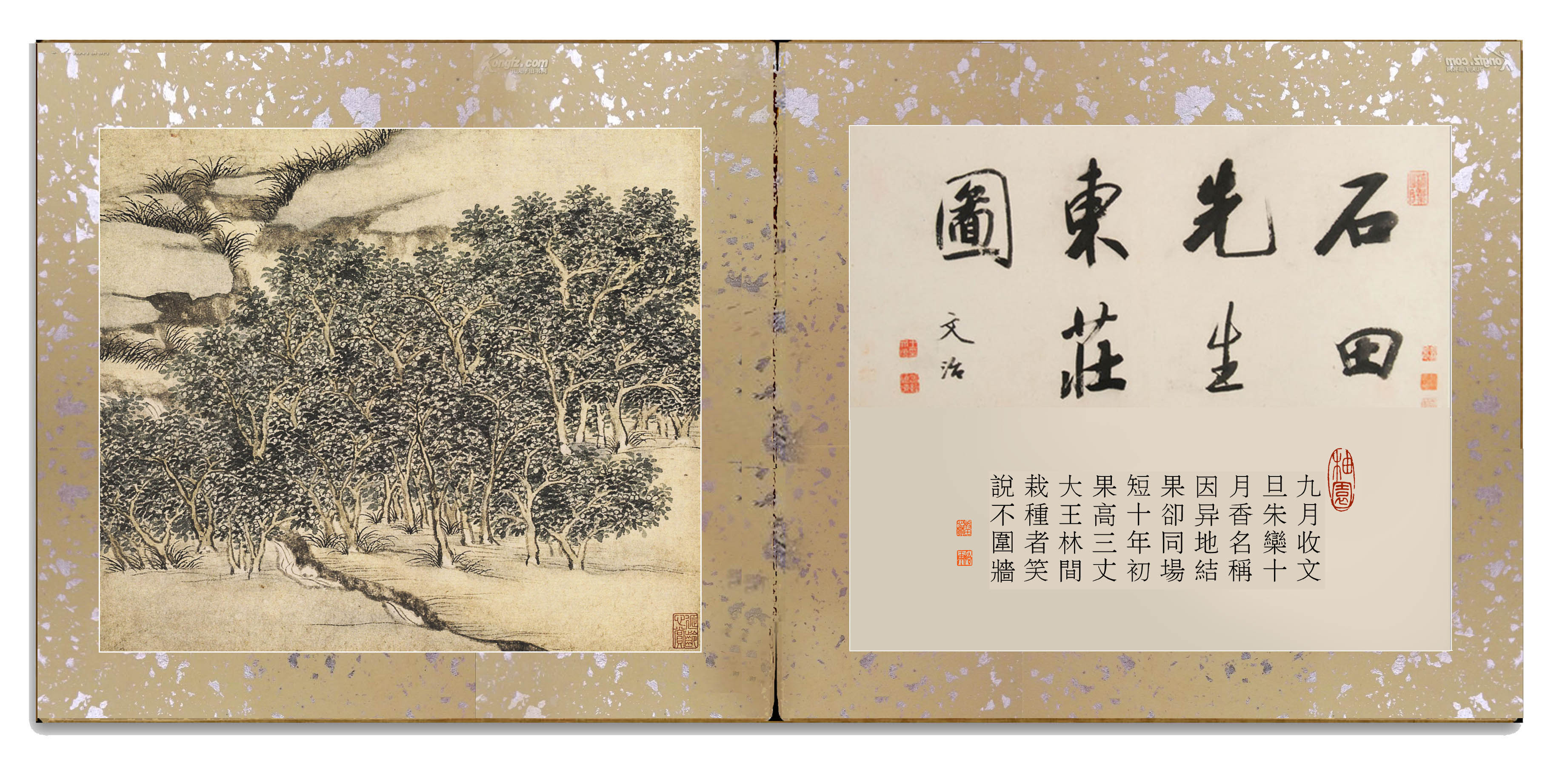 明•沈周《东庄图册》。纸本,浅设色,原有24开,遗失3开,存21开,每开图纵28.6厘米,横33厘米,南京博物院藏。此所藉乃第八开《果林》古画今题,标目及内容已非原意。