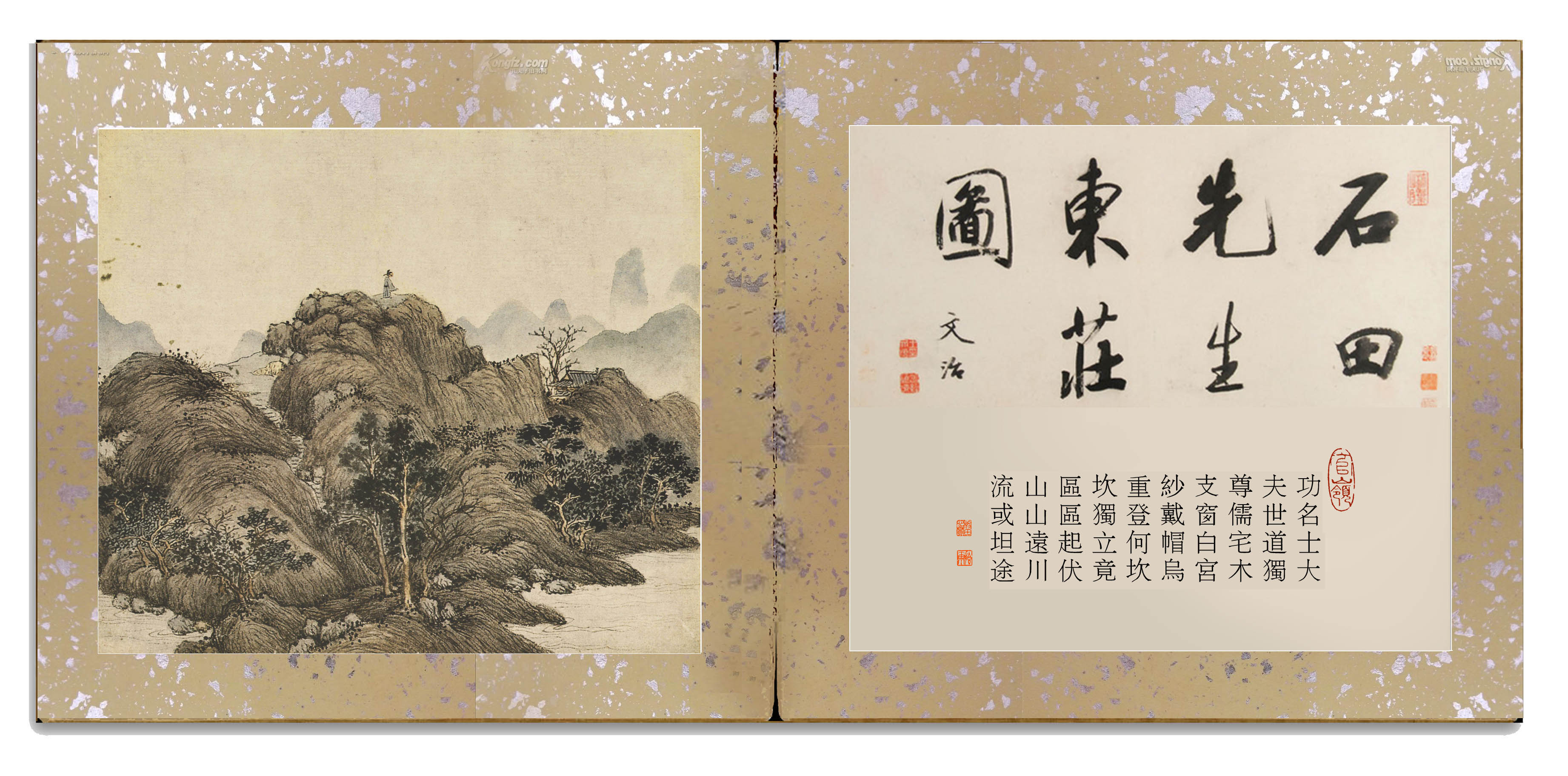 明•沈周《东庄图册》。纸本,浅设色,原有24开,遗失3开,存21开,每开图纵28.6厘米,横33厘米,南京博物院藏。此所藉乃第九开《振衣岗》古画今题,标目及内容已非原意。