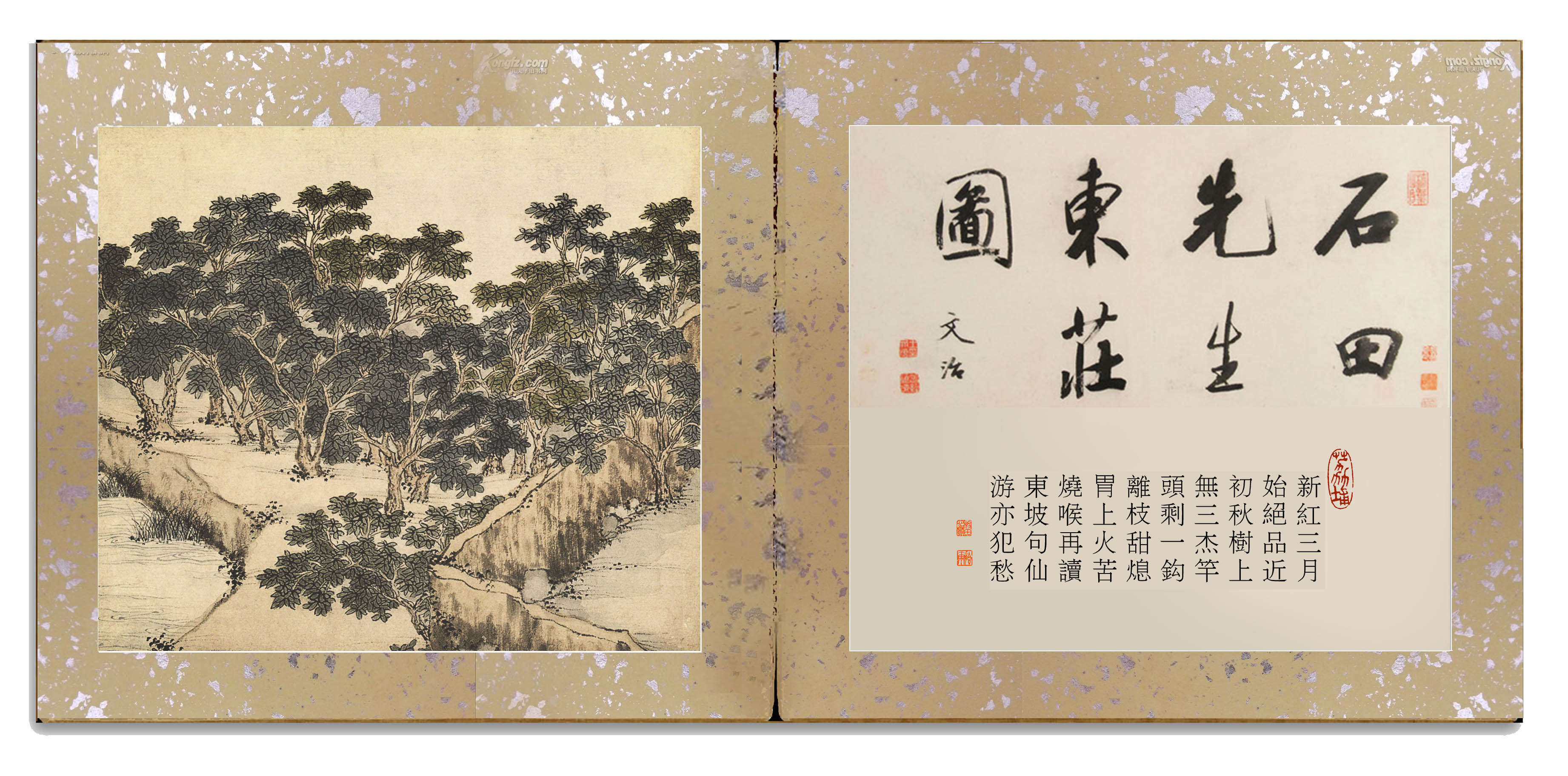 明•沈周《东庄图册》。纸本,浅设色,原有24开,遗失3开,存21开,每开图纵28.6厘米,横33厘米,南京博物院藏。此所藉乃第十开《桑州》古画今题,标目及内容已非原意。
