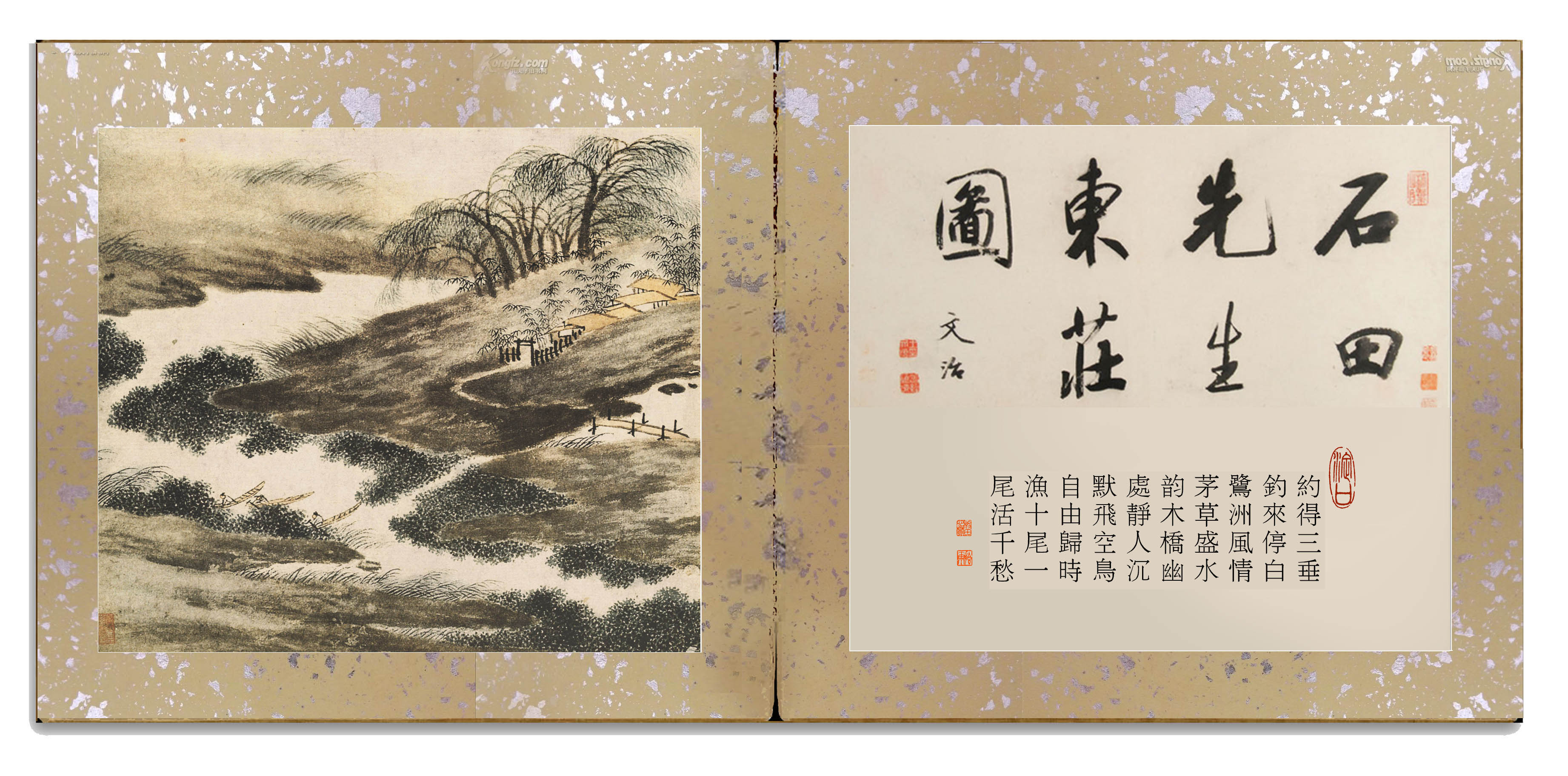 明•沈周《东庄图册》。纸本,浅设色,原有24开,遗失3开,存21开,每开图纵28.6厘米,横33厘米,南京博物院藏。此所藉乃第十二开《菱豪》古画今题,标目及内容已非原意。