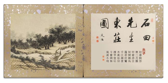 明•沈周《东庄图册》。纸本,浅设色,原有24开,遗失3开,存21开,每开图纵28.6厘米,横33厘米,南京博物院藏。此所藉乃第十三开《南港》古画今题,标目及内容已非原意。
