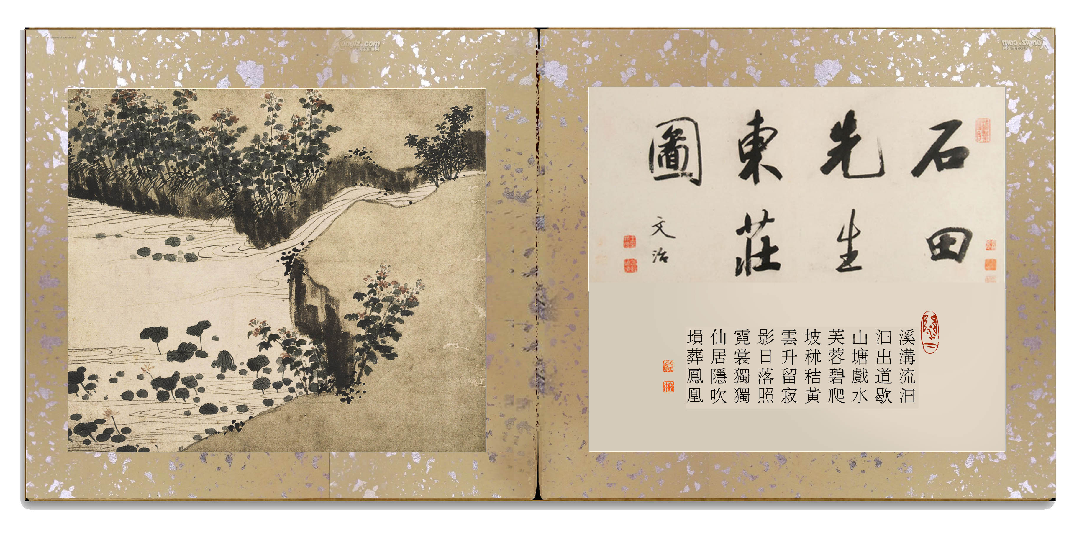 明•沈周《东庄图册》。纸本,浅设色,原有24开,遗失3开,存21开,每开图纵28.6厘米,横33厘米,南京博物院藏。此所藉乃第十四开《曲池》古画今题,标目及内容已非原意。
