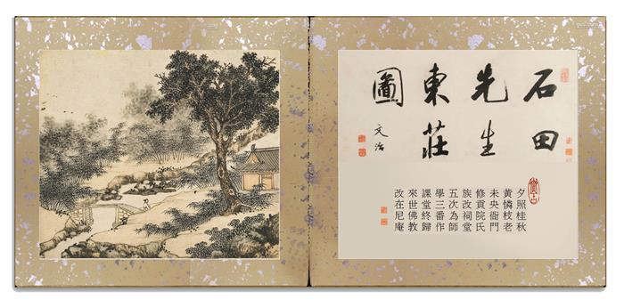 明•沈周《东庄图册》。纸本,浅设色,原有24开,遗失3开,存21开,每开图纵28.6厘米,横33厘米,南京博物院藏。此所藉乃第十五开《折桂桥》古画今题,标目及内容已非原意。
