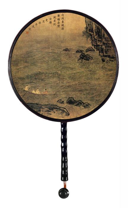 所藉宋•李嵩《赤壁图》。扇面画,绢本,水墨,设色,纵24.77厘米,横26.04厘米;美国堪萨斯市纳尔逊•艾京斯艺术博物馆藏。