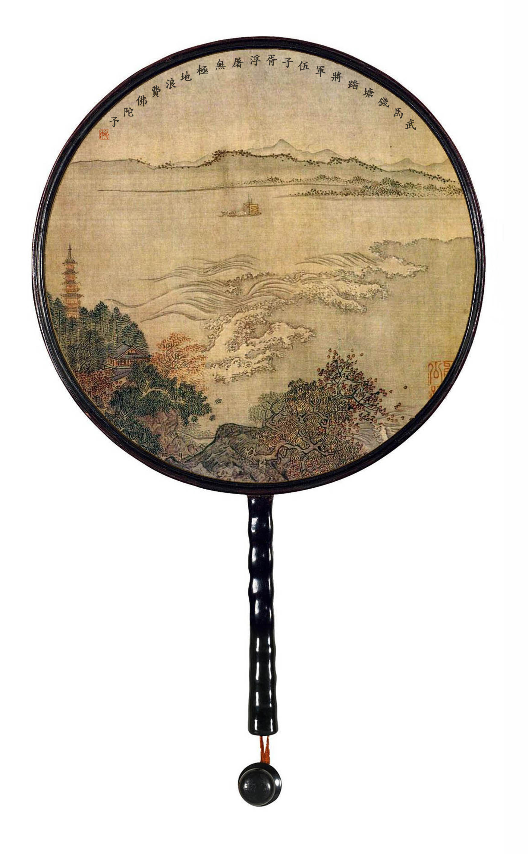 所藉南宋•夏圭《钱塘秋潮图》。扇面画,绢本,水墨,设色,纵25,2厘米,横25,2厘米,苏州市博物馆藏。