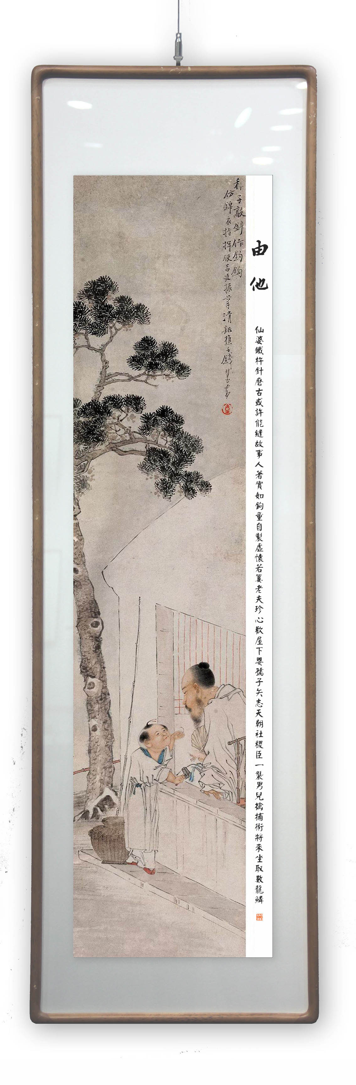 所藉清•钱慧安咸丰十一(1861)年所作《人物故事》,四屏之二,纸本,设色,画幅纵85,横19厘米。原款识“稚子敲针作钓钩”。
