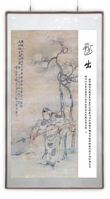 所藉清•钱慧安光绪二十三年(1897)年所作《木兰从军图》,立轴,绢本,设色,画幅纵85,横19厘米。原款识:“玉关一去别爷娘,十二年来返故乡。奇事奇人传诵久,休论元魏與萧梁”。