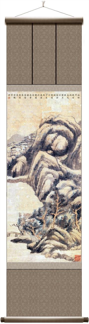 所藉明•董其昌《仿北苑山水》,镜心,纸本,设色,画幅纵59厘米,横26厘米。