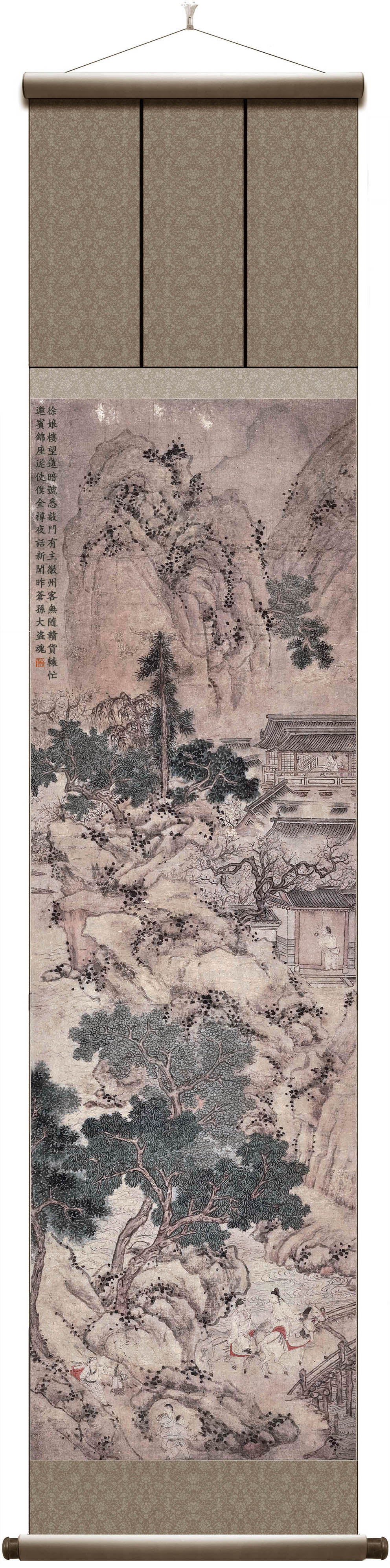 所藉明•文徵明《山庄客至图》,镜心,纸本,设色,画幅纵87.5厘米,横27.3厘米。