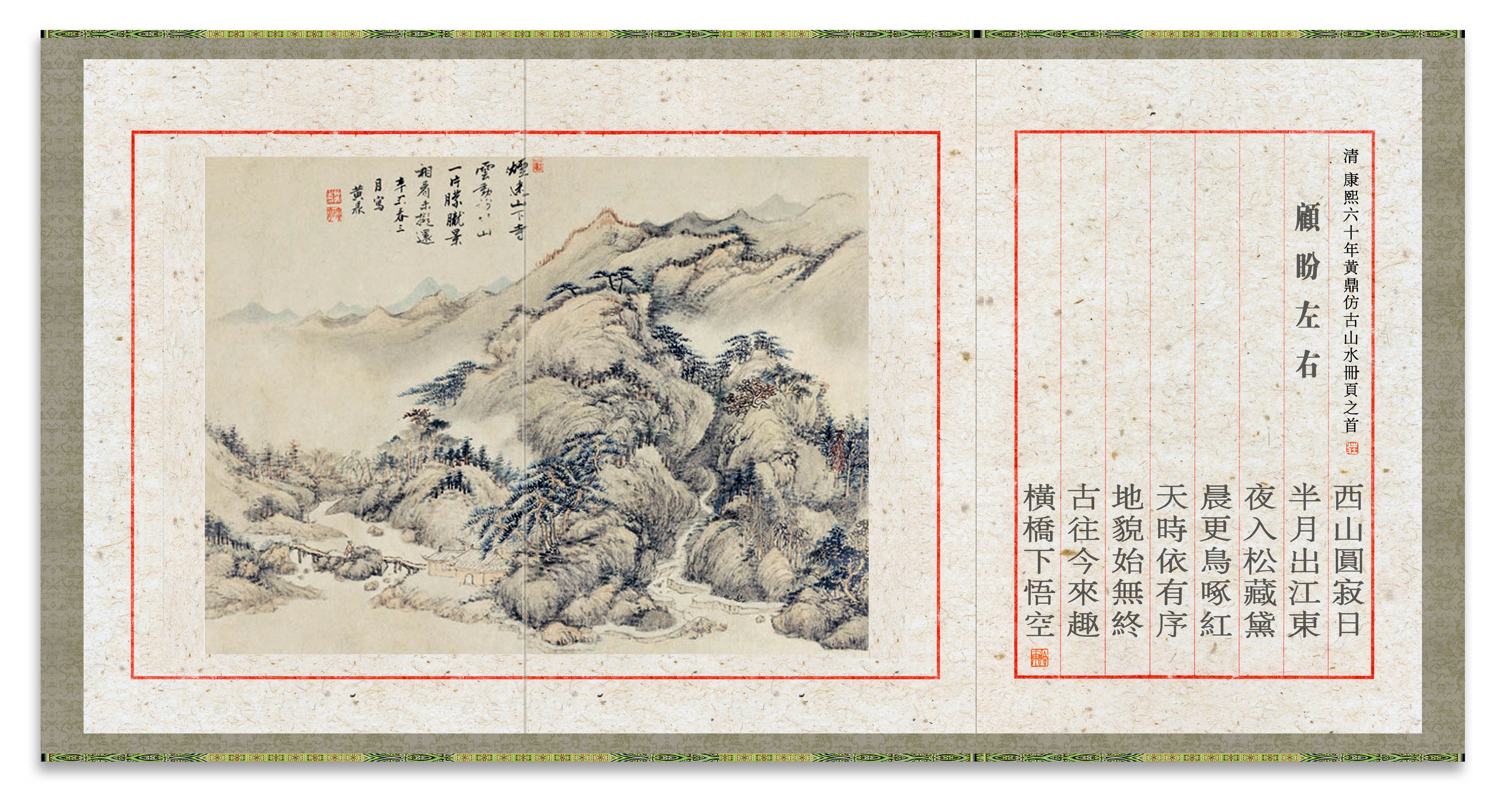 所藉清•黄鼎康熙六十年,即公元1721年作《仿古山水》册页八开之二,纸本,水墨,浅设色,画幅纵27厘米,横35.5厘米。