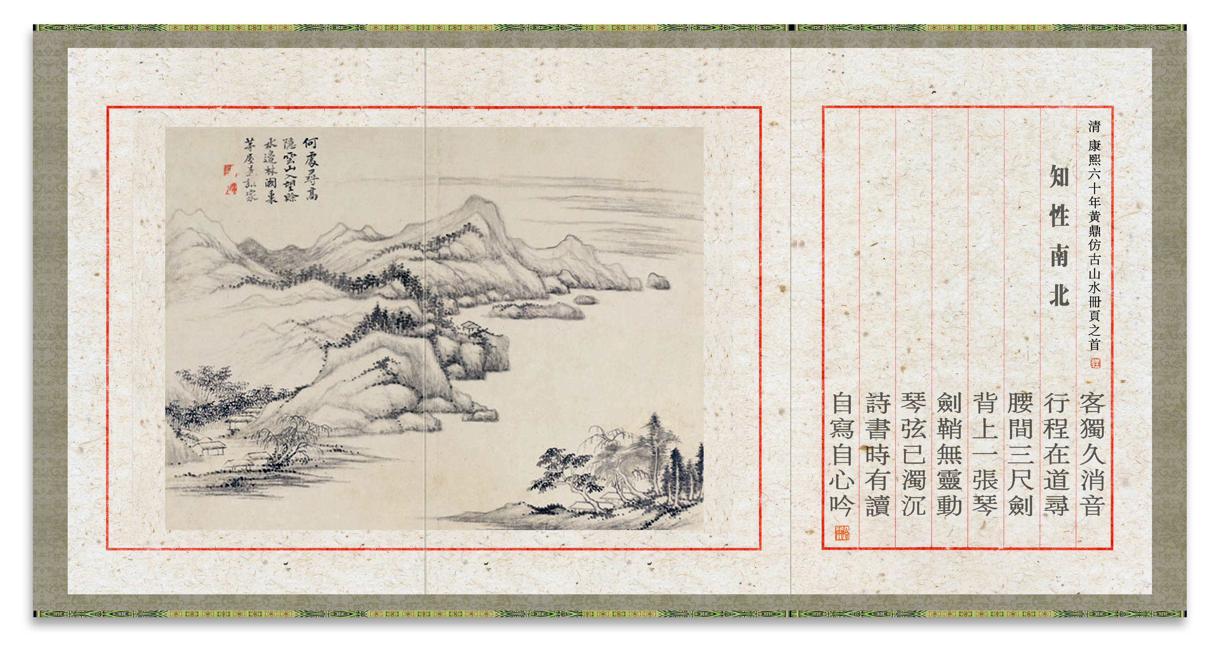 所藉清•黄鼎康熙六十年,即公元1721年作《仿古山水》册页八开之七,纸本,水墨,画幅纵27厘米,横35.5厘米。