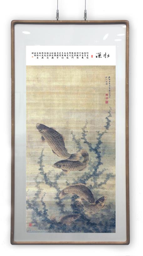 所藉清•沈铨《鱼藻图》立轴,水墨,设色,绢本,画幅纵154厘米,横84厘米。