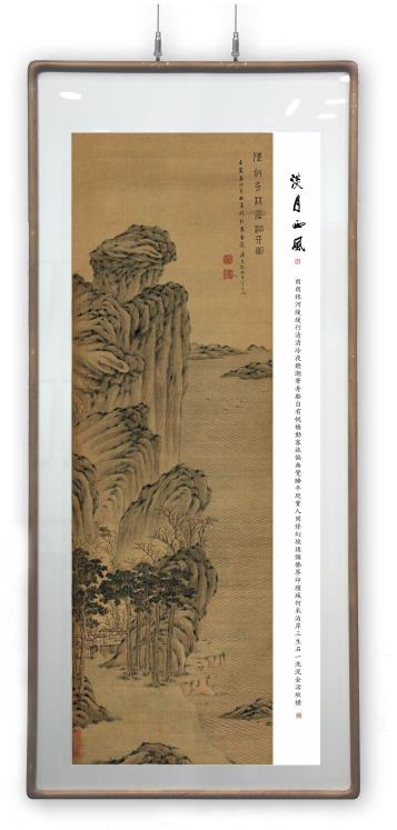 所藉清道光壬寅,即公元1842年潘思牧《仿古山水》四屏之一,立轴,绢本,设色,纵136厘米,横42.5厘米,幅面约0.9平尺,题识:“陆叔平林屋洞天图。壬寅春正月初吉,临于众香馆。潘思牧时年八十有七。”