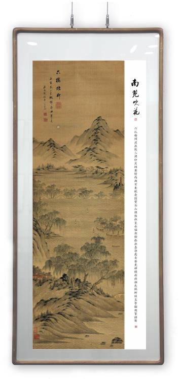 所藉清道光壬寅,即公元1842年潘思牧《仿古山水》四屏之二,立轴绢本,设色,纵136厘米,横42.5厘米,幅面约0.9平尺,题识:“六桥烟柳。壬寅春二月,仿恽南田笔意。潘思牧时年八十有七。”